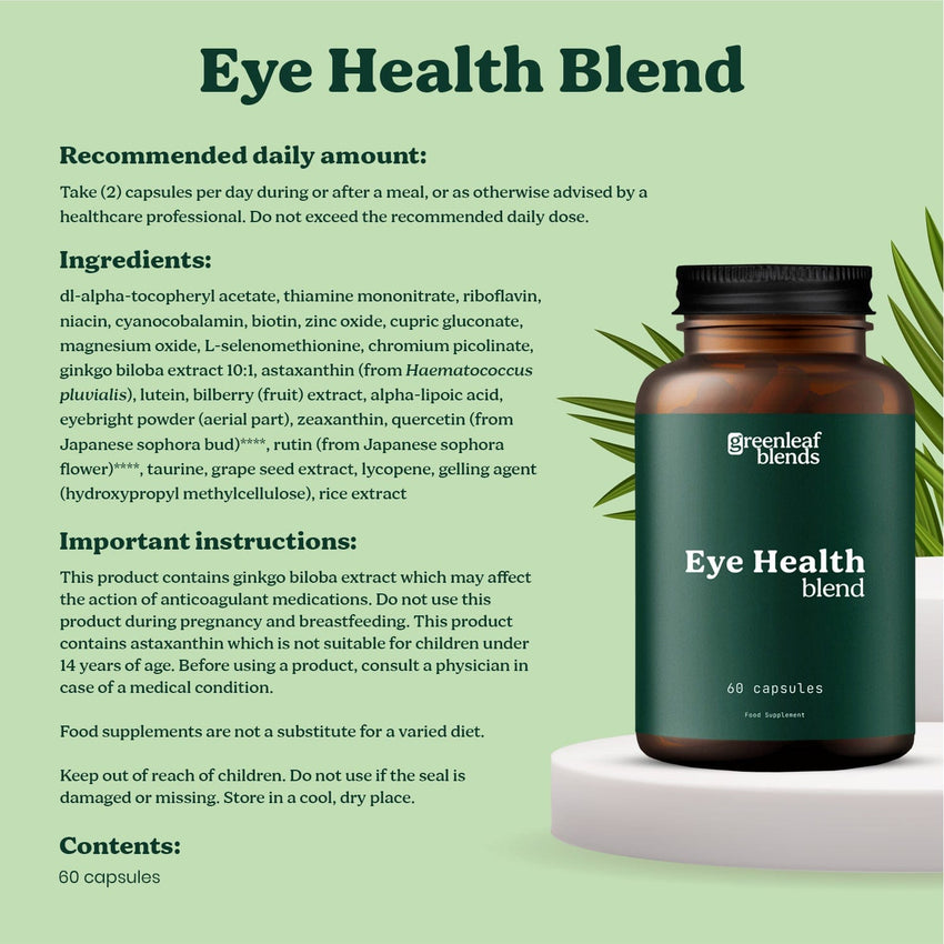 The Eye Health Blend is a natural supplement designed to support vision health through its unique combination of antioxidants, carotenoids, and essential nutrients. This scientifically-formulated blend works together to protect and nourish your eyes. Targeting the key factors that affect vision - oxidative stress, circulation, and nutrient absorption - Eye Health Blend provides comprehensive support. Its powerful ingredients help protect against blue light, support retinal function, and maintain healthy vision. By addressing these fundamental aspects of eye health, the formula offers a complete solution for long-term visual wellness.