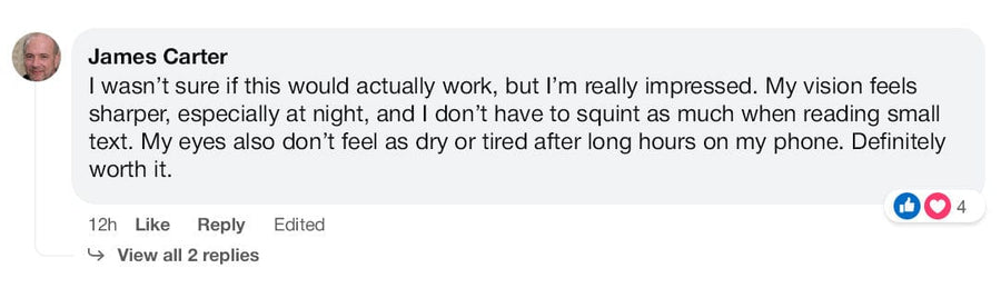 I’ve worn reading glasses for years, and I figured that was just how things were going to be. But after about six weeks of taking Eye Health Blend, I started noticing little changes, reading small text doesn’t feel as frustrating, and my eyes don’t get as tired in the evenings. It’s not some magic fix, but it’s helped enough that I’m sticking with it.