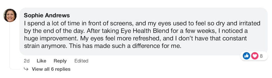 I used to wake up with dry, irritated eyes every morning, and it would take a while before things felt "normal." After a few weeks on Eye Health Blend, that dry, scratchy feeling is way less noticeable, and I feel like my vision is just a little clearer throughout the day. It’s not a drastic change, but it’s one of those things where you don’t notice how bad it was until it starts improving. Definitely glad I gave this a try.
