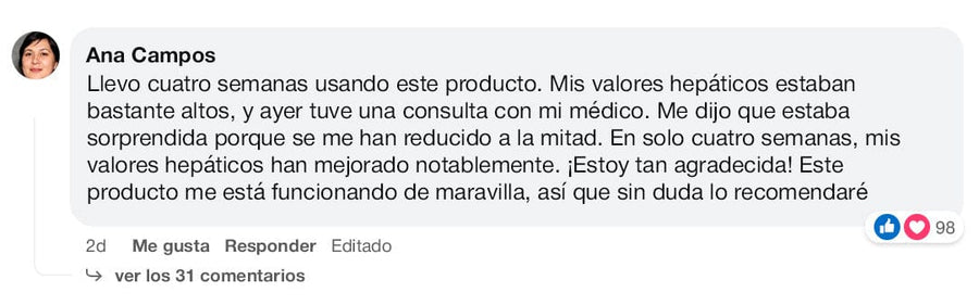 "Me encanta Liver Detox. Estuve batallando con la enfermedad del hígado graso, que además dificultaba mucho mi meta de perder peso. A las dos semanas de tomar 2 cápsulas al día, ya noté un gran cambio: esa fatiga matutina casi desapareció, y me siento mucho mejor en general. La sigo tomando y ya no tengo que recurrir a snacks poco saludables, ¡me siento bien y sin efectos secundarios!" — Hilda Gertrudis