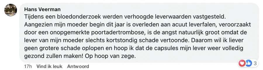 "Absoluut een aanrader. Ik had te kampen met leververvetting, wat mijn pogingen om af te vallen enorm in de weg stond. Na ongeveer 2 weken van continue inname van 2 capsules per dag van de Liver Detox Blend, merkte ik al een aanzienlijke verbetering. De vermoeidheid die me elke ochtend parten speelde, is nu nauwelijks nog merkbaar, en mijn algehele gevoel van welzijn is significant verbeterd. Ik blijf ze innemen, waardoor ik niet meer naar ongezonde snacks hoef te grijpen. Ik verdraag ze ook heel goed. Ik heb geen bijwerkingen ervaren." - Hilda Gertrudis