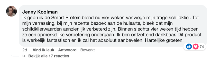 Het gebruik van de Smart Protein blend specifiek ontwikkeld voor mensen met een trage schildklier heeft een revolutionaire impact op mijn leven gehad. Voorheen voelde ik me constant uitgeput en leek het alsof ik nooit genoeg energie had om de dag door te komen. Echter, sinds ik enkele weken geleden begon met deze blend, heb ik een drastische omslag in mijn welzijn ervaren. Mijn energieniveau is merkbaar gestegen en over het algemeen lijkt mijn gezondheid sterk verbeterd. Dit product heeft me onverwacht ondersteund in mijn gewichtsverliesreis, waar ik al jaren tevergeefs mee bezig was. De positieve veranderingen die ik heb ervaren dankzij de Smart Protein blend zijn opmerkelijk, en ik ben er zeer enthousiast over. Ik zou het ten zeerste aanbevelen aan iedereen die problemen ondervindt door een trage schildklier. Het heeft voor mij een wereld van verschil gemaakt, en ik ben ontzettend dankbaar dat ik het een kans heb gegeven.
