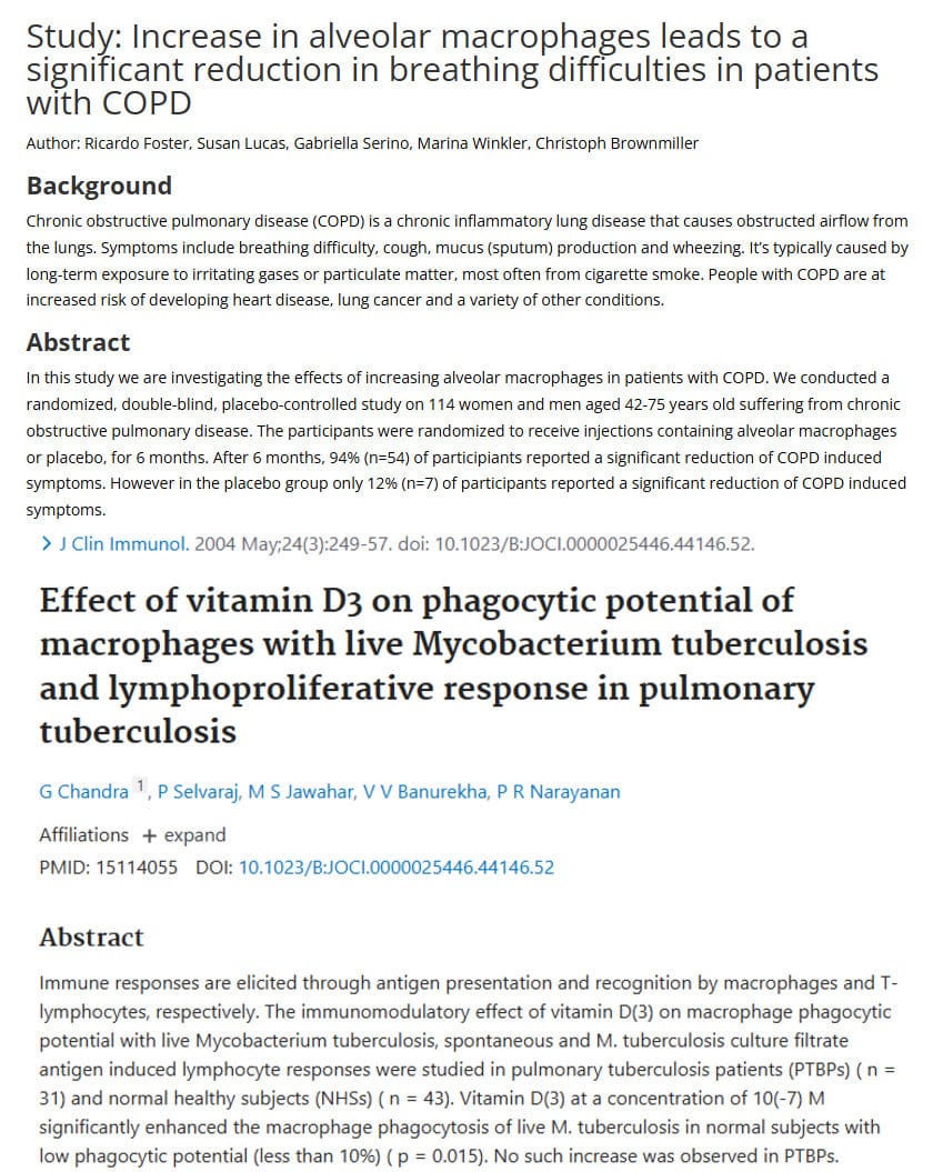 In 2021, a major breakthrough occurred in COPD research - researchers were able to significantly reduce the breathing difficulties of those affected. To achieve this result, the subjects received a natural preparation containing Vitamin D, Reiki mushrooms, L-cysteine, Elderberry extract, American ginseng, Mullein leaf extract, and Pine bark extract. This enabled them to significantly increase the number of alveolar macrophages (phagocytes in the lungs), thus removing the harmful substances from the lungs. As a result, the inflammation in the bronchi decreased, significantly reducing breathing difficulties. We have “recreated” the drug from the study with the same dosages, so that it is now available to anyone with COPD / chronic bronchitis / pulmonary emphysema. You can see the results of the study here again in black and white: