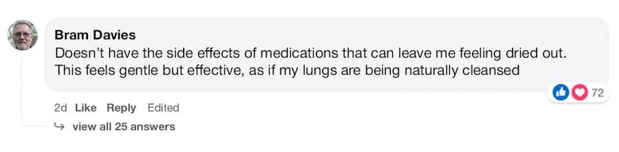 "I discovered this product in an article in an online magazine and was very curious. I thought to myself: if it works, then it is really an asset to anyone who has to deal with this. So I just ordered it, since I had nothing to lose with the guarantee. After only 4 weeks I already felt a change. Breathing became a little easier and the coughing decreased. After a few months I felt more resilient in general and breathing felt completely different. It was very liberating again and not so oppressive anymore. Really a great product. I am glad I discovered it."
