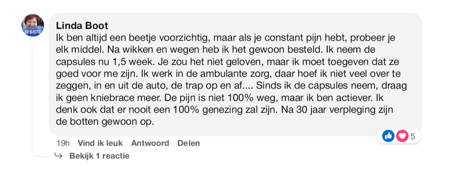 "Absoluut een aanrader. Ik heb artrose in mijn vingers en polsen en na ongeveer 2 weken inname van 3 capsules per dag is er al een duidelijke verbetering. De stijfheid 's ochtends is nu alleen nog maar minimaal en zelfs de knobbeltjes op de vingergewrichten zijn verminderd. Ik neem ze altijd, zodat ik alleen in noodgevallen naar ibuprofen en Voltaren hoef te grijpen. Het is absoluut een goed alternatief voor alle medicijnen. Ik verdraag ze ook heel goed. Ik heb geen bijwerkingen ervaren." - Helga A.