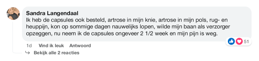 "Nadat ik MSM had geprobeerd, wat helaas niet werkte, probeerde ik deze formule. Het duurde even en het was ongebruikelijk voor mij om 3-6 capsules per dag te nemen, maar de resultaten spreken voor zich. Ik heb het product nu nog een keer besteld. Ik heb ook een keer geprobeerd om te stoppen met de capsules. De pijn kwam meteen terug. Dus dat betekent dat ik deze capsules permanent zal blijven innemen. Ik ben zeer tevreden. Ik heb vooraf van alles geprobeerd en niets hielp. Ik ben niet helemaal pijnvrij, maar het gaat zeker veel beter dan voorheen en ik heb geen bijwerkingen." - Olga D.