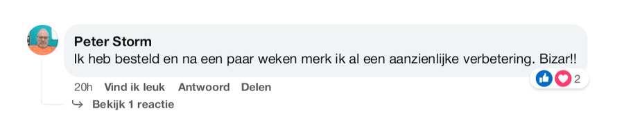 "Mijn artrose is echt minder pijnlijk . Ik ben bijna pijnvrij en kan mijn heupgewricht nu steeds zwaarder belasten, ondanks grote fouten van specialisten, waaruit blijkt dat het kraakbeen daadwerkelijk regenereert." - Johan S.